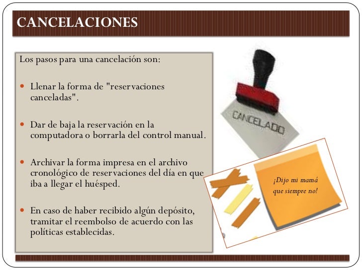 En la mayoría de los hoteles la anulación de reservación ya confirmadas y pagadas genera lo que se conoce como gastos de reservación que se compensa de forma automática y sin excepción con el cargo de gastos administrativos del 10% del monto de la factura.